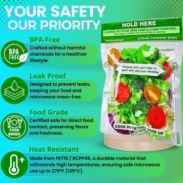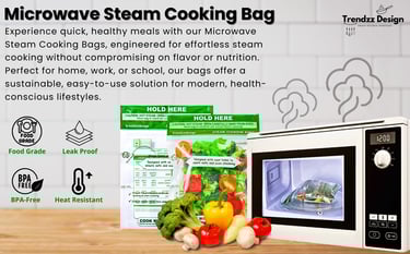 Our flagship product, the Microwave Steam Cooking Bag, is perfect for busy professionals, health-conscious families, and anyone who loves fresh, flavorful meals. Designed for convenience, our BPA-free, food-grade bags feature advanced heat-resistant materials (up to 275°F/135°C) and a secure zip-lock design to prevent leaks and preserve freshness.